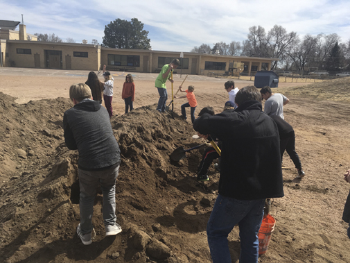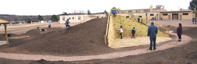 “Each division [defined grade levels] of students will be responsible for monitoring the plant life and structures in their forest area and brainstorming ecological solutions as needed,” states a flyer handed out at the event March 22. A "grand opening" for a more finished version of the playground is tentatively scheduled in August, the flyer adds. The "@Pike Park" part of the Forest Green name is a reference to Colorado Springs' Pike Park just north of the school (from which the city removed its playground equipment a few years ago). The school's project has been chiefly funded through internal fundraising and a Great Outdoors Colorado (GOCO) grant. Much of the dirt (totaling