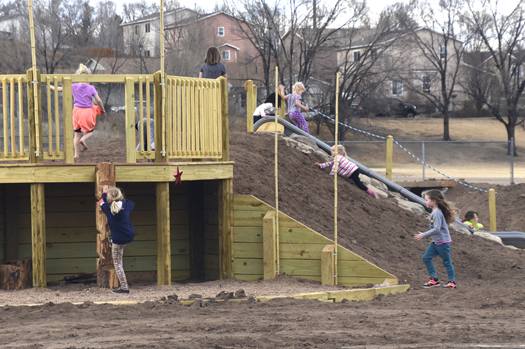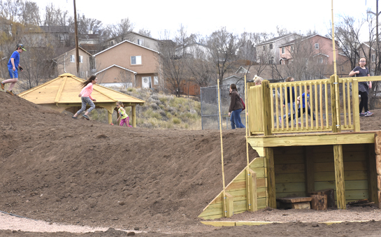 The customized playground at the Academy for Advanced & Creative Learning (AACL) had its “first opening” March 22… and there's more to come. Called Forest Green @Pike Park, the roughly one-acre area currently includes a “castle” and slide, wooden climbing wall and large mounds of dirt that are to be shaped into added features in the months ahead, along with trees, sod, a garden and a sprinkler system. The preliminary nature of the facility did not seem to deter scores of youngsters from the K-8 District 11 charter school before the March 22 ribbon cutting. They raced around the space, sometimes for the pure joy of going up one mound and down another. According to AACL Principal Nikki Myers, “several phases” lie ahead, which will expand on the “forest” areas already in place. The names of those areas stem mostly from books (Hundred Acre Wood - “Winnie the Pooh”; Sherwood Forest (stories of Robin