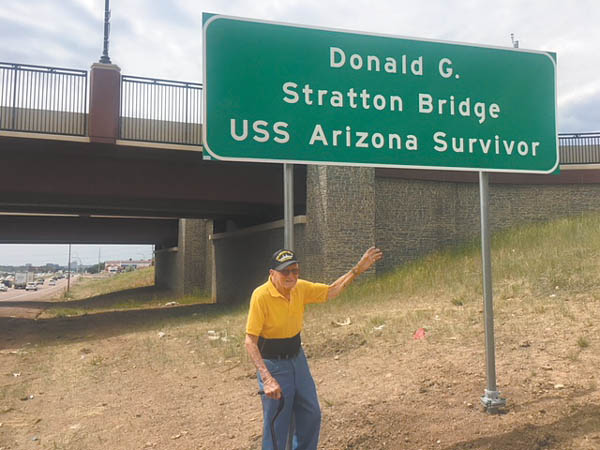 A Colorado Springs resident these days - in the Holiday Village retirement community just east of I-25 and scarcely a mile from the new Fillmore/I-25 bridge - Don Stratton was honored in June by having that bridge named after him. He is one of just five remaining survivors from the attack on the battleship Arizona and the only man left who served in both the first and last battles of World War II. (The last was Okinawa.) The bridge-naming ceremony featured guest speakers, the unveiling of the sign, local boy scouts leading the Pledge of Allegiance, a local Navy JROTC cadet color guard and a special memorial flag presentation to the daughter of the sailor (Joe George) who saved Stratton and five others at Pearl Harbor. The sign reads: “Donald G. Stratton Bridge - USS Arizona Survivor.”